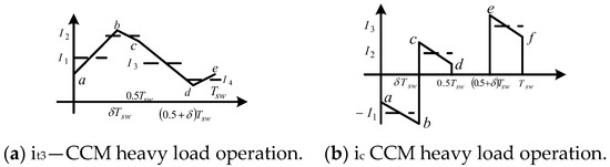The DC–DC converters shown in Figure 10a,b have a decoupling capacitor that connects to a node which forms a type-3 BBB. The capacitors’ current signals for a type-3 BBB are shown in Figure 10a–d. Figure 10c,d shows how the shape of the capacitor current waveform changes with load.