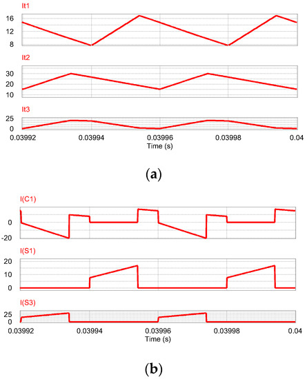 Figure 16a presents simulated current waveforms it1, it2, and it3. Figure 16b, on the other hand, presents current waveforms for the coupling capacitor, ic, inductor L1, iL1, and inductor L2, iL2, for converter 2-3.1. It is seen from Figure 16 that the simulated waveforms are similar to the analytical waveforms shown in Figure 2c, Figure 5a–c, Figure 6a–c, and Figure 8a–e and which were used to derive the analytical expressions. On the other hand, Table 3 presents analytical and simulated data relevant to converter 2-3.1. In particular, the average and RMS values as well as ripple RMS values for the current signals it1, it2, it3, and ic.