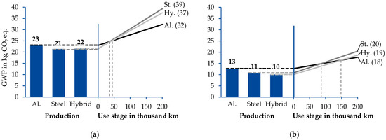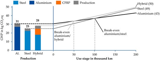 - Koffler, C.; Rohde-Brandenburger, K. On the calculation of fuel savings through lightweight design in automotive life cycle assessments. Int. J. Life Cycle Assess. 2010, 15, 128–135. [Google Scholar] [CrossRef]