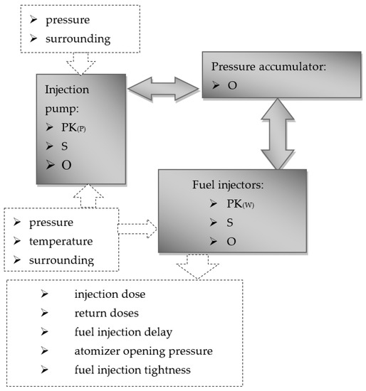 The operating conditions of the Common Rail system intensify the wear processes of its individual components. Elements of precision pairs on the fuel injector wear out the fastest during operation. The wear processes of elements of the CR injection system can be divided into tribological and non-tribological. Most often, the phenomena of the intensity of consumption of elements of the fuel supply system overlap. Phenomena occurring in the fuel supply system related to the operation and wear of individual components can be considered in terms of the system. The tribological system of the injection system components consists of kinematic pairs, lubricant, and the surroundings. Kinematic pairs (PK) are tribological associations where friction and wear processes occur and take place. Lubricant (S) is a substance whose introduction into the elements of kinematic pairs reduces their friction and wear. The immediate surroundings (O) are the operating conditions of the system. In the case of fuel supply systems, these are pressure, pollution, and operating temperatures of components. Figure 1 shows the tribological system of the power supply system with the Common Rail system.