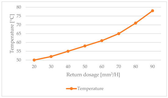 A measure of the wear degree of precision pair elements can be the temperature that occurs in the area of tribological associations. As a result of reducing the tightness of precision pairs, the speed of the liquid flowing through them increases, which results in an increase in temperature. Research conducted by the authors of [19] showed that if the overflow dose is above 60 mm3/H, then the fuel temperature begins to increase significantly (Figure 2).
