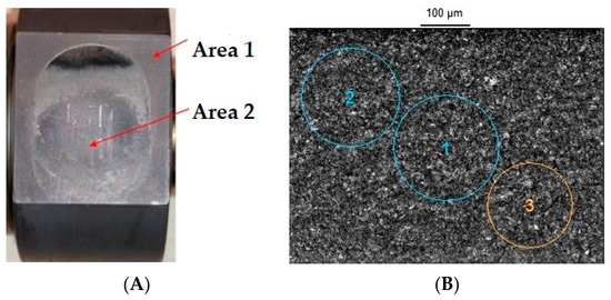 The area photos were taken with different zooms. Figure 6, Figure 7 and Figure 8 show the plate surface of the high-pressure section analyzed by EDS at different zoom with separate areas. Common view of samples during the test (A) diesel fuel, (B) rapeseed oil methyl ester B100 (Figure 9), local view of the surface of tested samples (A) diesel oil, (B) biofuel (Figure 10) permit to compare influence of hydrogen-containing “green” fuels and their role in the thermal protection of structural materials at high temperature and pressure. Table 2, Table 3, Table 4 and Table 5 present the composition of the elements found during the study.