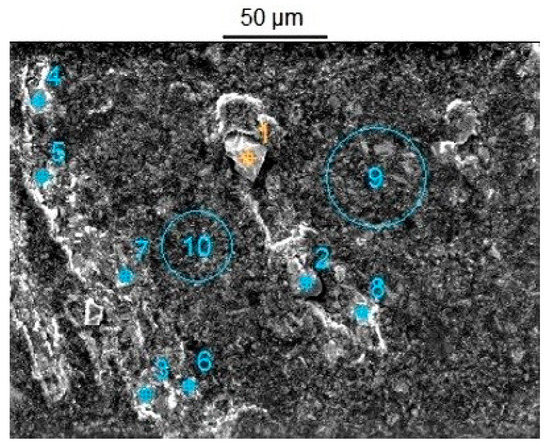 Friction bearings propel high pressures sections in the fuel pump. This is the contact surface between the cam surface and the high-pressure piston. The cam surface layer is molybdenum disulphide (MoS2). MoS2 belongs to types of materials including hydrogen intercalated layered alloys (hydrogen location in the Van der Waals gap). It is known that the presence of alloying elements in the structure of modern steels, such as manganese, chromium, tin, molybdenum, and some others, reduce hydrogen permeability and, consequently, hydrogen wear [20,21,22] (hydrogen content in wear products—from 3.0 up to 6.2 ppm). The main task of the layer is lowering friction forces. Due to low lubricity, this layer has been wiped off [23,24,25]. Friction forces in these area increase and metal filings have been produced [26,27,28,29]. Table 1 shows the results of microscopic studies (Figure 4) with the number of individual elements.