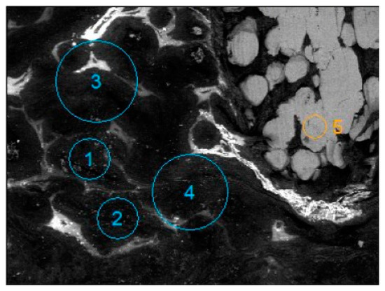 Chemical composition measured in areas according to Figure 4 by the EDS method.