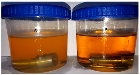 View of samples during the test (A) diesel fuel, (B) rapeseed oil methyl ester B100.