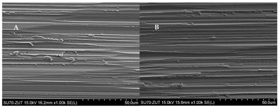 Cam surface in area 2 according to Figure 3 by the SEI method (A)—100 μm, (B)—50 μm.