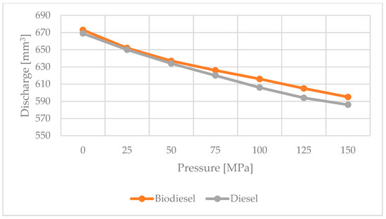 The next stage of research was the analysis of the operating parameters of the injection pump and fuel injectors working on conventional fuel and hydrogen-containing B100. Studies have shown that the output of the diesel fuel injection pump is similar to that of the B100 of hydrogen-containing rapeseed oil methyl ester. However, during the tests on an electromagnetic injector for vegetable fuel, the injection dose values were smaller, especially at lower pressures. This is influenced by the physical properties of biofuels, such as viscosity, density, and surface tension, and takes in to account hydrogen degradation of structural materials [50,51,52,53]. Several factors affect the injection dose in a Common Rail electromagnetic fuel injector. The scope of the CR valve operation and the fuel injector response time from the moment the coil is actuated to the opening of the atomizer are very important. The principle of operation of CR system fuel injectors shows that the larger the range of valve operation, the greater the pressure difference between the control valve assembly and the atomizer. If the pressure difference is greater, then the needle rises higher, and the injection dose increases. The physical parameters of the fuel affect the injector response time. Increased density, viscosity, and surface tension lengthen this process, which affects the size of doses and the angle of fuel injection in the running engine. It is similar to the number of overflow doses. Increased physical parameters reduce fuel fluidity, reducing doses. The differences in dose sizes were greater for lower system pressures. This is due to the nature of the flow. Simulation tests conducted by the authors [5] showed that at lower pressures the fuel flow velocities in the injector are lower, which at higher viscosity and density may affect its injector response, that is, the time from its activation to fuel injection into the engine’s combustion chamber.