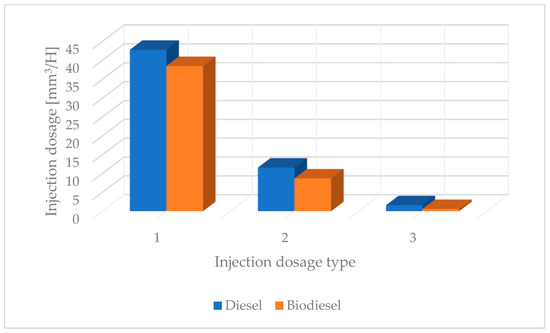 Analysis of the injection doses of the tested fuel injector working on classic diesel oil and biofuel: 1–120 MPa, 700 μs, 2–70 MPa, 500 μs, 3–50 MPa, 300 μs.