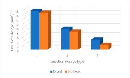 Analysis of the overflow dose rates of the tested fuel injector working on classic diesel oil and biofuel: 1–120 MPa, 700 μs, 2–70 MPa, 500 μs, 3–50 MPa, 300 μs.