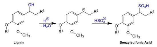 Lignosulfonate is a by-product of the less-used sulfite pulping process. In this process, a sulfite (i.e., NaSO3) is used to break the ester bonds between lignin molecules that bind the cellulose fibers, a process known as delignification. Like Kraft lignin, lignosulfonates come in a broad range of complex compositions and molecular makeups but are less fragmented. They all include the SO3H side chain of the lignin aromatic alcohols, shown in Figure 3. They are produced from black/red liquor, a waste by-product of the acid pulping of wood fiber in the pulp and paper industry. Lignosulphonates can be precipitated from the liquor through the addition of a metal hydroxide. When used as a binder, bonding between lignosulphonate molecules typically occurs at the free phenolic hydroxyls.