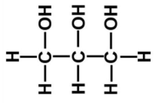 Glycerol is a by-product of the biodiesel production process. For every 10 kg of biodiesel produced, 1 kg of glycerol is produced through the transesterification of fats and oils (triglycerides). Glycerol primarily acts as a plasticizer and has the potential to soften other polar molecules, such as lignin. The hydroxyl groups on the glycerol molecule, shown in Figure 4, could disrupt the intermolecular hydrogen bonds of the lignin in much the same way as water.