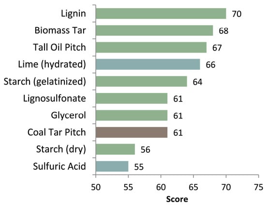 Also referred to as “biomass oil” or “pyrolysis oil”, biomass tar is a liquid produced when biomass is heated above 300 °C in an oxygen-free environment. In the temperature range of 200–300 °C, torrefaction occurs, driving off moisture and lighter volatiles, which can be condensed into an aqueous, low-viscosity “oil”. In the range of 300–500 °C, pyrolysis begins, and heavier hydrocarbons are driven off, producing biomass tars. Biomass tar is a complex mixture of hundreds of hydrocarbons produced through the thermal decomposition of lignin, hemicellulose, and cellulose as well as oils, waxes, and other minor components of biomass. It binds the wood particles through formation of a film on the particles and “gluing” the particles together. Concentrations of up to 50 wt% can be used depending on the feedstock; however, typically, concentrations are in the range of 2 to 20 wt%. White stated that a minimum of 3 wt% biomass tar binder was required to ensure sufficient coverage of the biomass particles [64]. The heavier tars are immiscible with water and not prone to weathering. Tar creates very durable pellets, but there could be potential issues associated with leaching and off-gassing of the lighter polycyclic aromatic hydrocarbons (PAHs), some of which could be toxic. Addition of tar to wheat straw increases the mechanical strength and LHV of pellets considerably [65]. By addition of 35 wt% tar, the LHV increased between 20–26% depending on the feedstock [65].