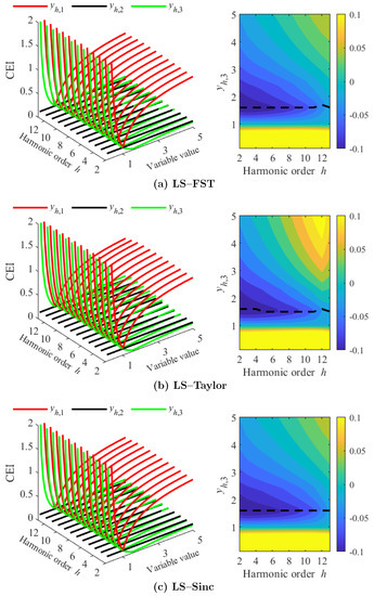 So far, the optimization for the three least-square algorithms is achieved under the given time window c and signal model order Q ( for LS-FST and LS-Sinc; for LS-Taylor). The following is an example to visually display the optimization results. For a simple case, the time window length is set to three nominal cycles, and the signal model order is set to 3 for the least-square algorithms, i.e., . Then, three variables, and , are introduced. Figure 1 shows their relationships with the CEI while the other two variables are fixed to unchanged one. It can be seen that: (1) The individual change of toward either direction from one will increase CEI, (2) CEI is independent of , and (3) can reduce CEI when it is greater than one. The optimal value for each harmonic is chosen at the valley of the green curve. For the same least-square algorithm, the optimal values for different harmonics are slightly different, 1.56–1.66, 1.46–1.59, and 1.56–1.64 for the LS-FST, LS-Taylor, and LS-Sinc, respectively.