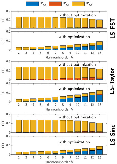 It is observed that the estimation error curves of the three least-square algorithms with the proposed optimization in Figure 6, Figure 7 and Figure 8 appear to be the same curve trend as the optimized subplots in Figure 2. This is because for high-order harmonic, the error EP caused by passband ripple takes a larger proportion, and EP related to the transition band becomes smaller. The proposed optimization realizes CEI reduction by decreasing EP, and hence the CEI reduction becomes smaller with the harmonic order increase. Namely, the proposal yields better performance improvement for low harmonics than for high harmonics.