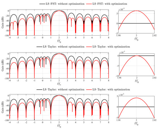 The CEI change with and without optimization for the three least-square algorithms is plotted in Figure 2. The results agree with the analysis: (1) EP and EP caused by fundamental leakage, mutual harmonic interference, and OBI components are well suppressed after optimization; (2) the EP related to the filter passband ripple increases, but the overall CEI, especially for , is reduced considerably. This observation is further verified by the frequency responses in Figure 3, i.e., the optimized harmonic filters reduce transition band and stop band gain, but enlarge passband ripple.