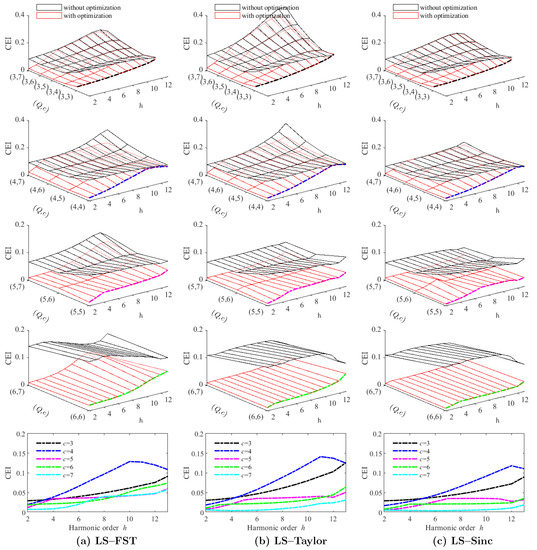It is interesting to know whether the proposed optimization in (22) always has the effect of CEI reduction and harmonic phasor estimation accuracy improvement under different least-square order Q and window length c. Here we show numerical examples in the range {3, 4, 5, 6, 7} for both parameters. 1, and 2 are not considered because they yield only one variable for optimization, and changing can only increase the CEI value. Since , c can not go lower than 3. The upper limit, 7, is considering the length limit set in IEC/IEEE standard [11]. Figure 4 displays the results of three least-square algorithms with and without the proposed optimization in three columns.