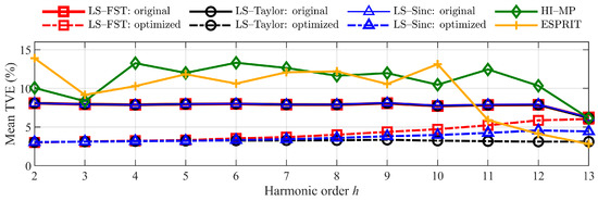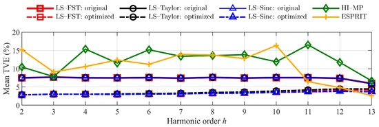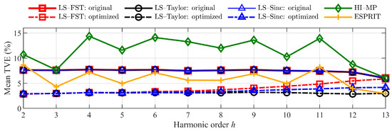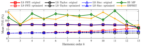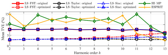 Figure 12 shows that the optimized LS-FST, LS-Taylor, and LS-Sinc maintain the mean TVEs at a low level. The TVE reduction is over 0.043, 0.046, and 0.047 for harmonics with an order from 2 to 10. Moreover, the error values and volatility of the optimized least-square method are smaller than those of the HI-MP and ESPRIT algorithms.