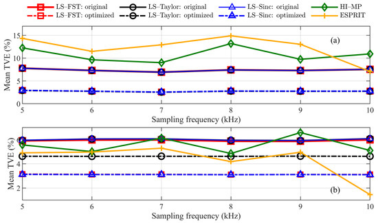 The mean TVE for (a) second and (b) thirteenth harmonic phasors of LS-FST, LS-Taylor, and LS-Sinc with and without the proposed optimization, as well as the HI-MP and ESPRIT methods under sampling frequency test.
