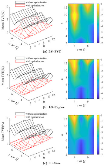 The left subplots show the relationship between the mean TVE of each harmonic and the time window length c (or signal model order Q) for the (a) LS-FST, (b) LS-Taylor, and (c) LS-Sinc with and without the proposed optimization. The right subplots show the optimized TVE change, and the reference is the TVE before the optimization under the same parameter configuration.