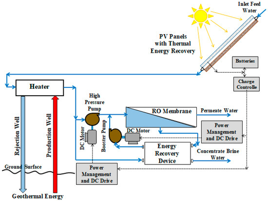 The Middle East and North Africa region is one of the first countries in the world to suffer from water poverty as a result of climate change and population increase. Meanwhile, reverse osmosis desalination systems are among the most popular desalination systems used to treat brackish water, seawater, and groundwater. Therefore, this study aims to devise environmentally friendly improvement methods to improve the productivity of reverse osmosis units and reduce their electrical energy consumption rates. To achieve this idea, the geothermal energy and thermal recovery system of photovoltaic/thermal panels as renewable thermal energy sources were incorporated with the RO desalination unit to preheat the feed water before entering the RO desalination unit using geothermal energy. This will cause an increase in the productivity rates of potable water and reduce the rates of power consumption. Simplified schematics of the proposed RO desalination cycle incorporated with the geothermal energy and the photovoltaic/thermal panels are shown in Figure 1. The proposed system consists of photovoltaic/thermal panels, geothermal energy, and an RO desalination unit with an energy recovery device. The feed water is first preheated in the thermal recovery device of the photovoltaic/thermal panels, as well as two cool PV panels to increment the rate of output electricity. After that, the feed water is heated using geothermal energy to raise the feed water temperature before its pumping into the RO desalination unit with a PX pressure exchanger energy recovery device.