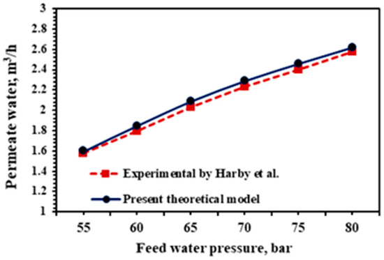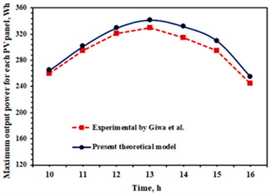 To confirm the validity of the theoretical models of the hybrid system proposed in this study, Figure 2 presents a comparison between the results of the theoretical model of solar photovoltaic/thermal panels with the empirical data collected by Giwa et al. [33]. It is shown in Figure 2 that the maximum deviation between the proposed model results and empirical data is 3.60% Additionally, Figure 3 presents a comparison between the results of the theoretical model of the RO unit with an energy recovery device and empirical results derived by Harby et al. [34]. Meanwhile, it is shown in Figure 3 that the maximum deviation between the proposed model results and empirical data is 2.38%.