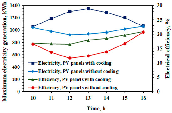 In the proposed system, PV panels are used to produce the electricity required to run the pumps of the desalination unit, and to increase the rates of electricity generation, a thermal recovery unit was integrated with PV panels in order to reduce the PV cell temperature and thus raise the rate of output electricity. At the same time, the heat recovery unit represents the first preheating unit to heat the feed water before it enters a desalination system. Figure 5 shows an hourly variance of maximum electricity generated by PV panels and its efficiency for the cases with and without the thermal recovery system. As shown in Figure 5, during the period from 10:00 a.m. to 6:00 p.m., the maximum electricity produced by the PV panels in the case without using the thermal recovery system varied between 925 and 1065 watts, but for incorporating the thermal recovery system with photovoltaic panels, the rates, electricity generation was increased and ranged between 1060 and 1350 watts. The rate of improvement in electricity generation reached between 0.47% and 43.6% when incorporating the thermal recovery system with photovoltaic panels. This variation in the rates of improvement in electricity generation is due to the effect of changing the intensity of the incident solar radiation on the PV panels and the ambient air temperature. Meanwhile, at 10:00 a.m. and 4:00 p.m., the cell temperature of the PV panels without cooling is low, and therefore, the amount of improvement in the rates of electricity generation is low in the range of 0.47%. However, with the increase in the intensity of solar radiation, the cell temperature of the PV panels rises at great rates, and therefore, the use of cooling technology is very effective, as the rates of improvement in electricity generation reached 43.6%. Additionally, the electrical efficiency of PV panels without a thermal recovery system varied between 11.7% and 20.8%, but for incorporating the thermal recovery system with photovoltaic panels, the rates of electrical efficiency were increased and ranged between 16.7% and 20.9%.