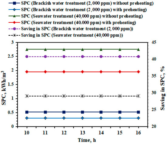 Figure 6 shows the influences of preheating units on power consumption rates in the RO unit with an energy recovery device. As shown in Figure 6 for brackish water treatment, the SPC for the RO desalination unit with an energy recovery device reached 0.52 kWh/m3 for the cases without utilizing preheating units (geothermal energy and thermal recovery system of PV panels), while for utilizing the thermal recovery system of PV panels and geothermal energy as preheating units, the SPC was reduced to 0.308 kWh/m3. Additionally, for seawater treatment, the SPC for the RO desalination unit with an energy recovery device reached 2.75 kWh/m3 for the cases without utilizing the preheating units, while for utilizing the thermal recovery system of PV panels and geothermal energy as preheating units, the SPC was reduced to 1.95 kWh/m3. The saving in the specific power consumption for utilizing the thermal recovery system of PV panels and geothermal energy as preheating units reached 29.1% and 40.75% for seawater and brackish water treatment, respectively.