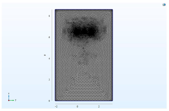 The electric-field integral inversion method realizes voltage inversion based on the electric-field distribution of the plumb line below the conductor. To improve the existing integral inversion method, it is necessary to analyze the spatial electric-field distribution of overhead lines. In this study, the COMSOL Multiphysics finite element simulation software is used to calculate the electric-field distribution rule below the line. In the simulation model, the three-phase lines are arranged horizontally. The wire material is set to aluminum, and the radius and length of the wire are set to 16 mm and 2 m, respectively. The distance between the conductor and the ground is 6.5 m, and the distance between the adjacent phase conductors is 0.65 m. The wire voltage is set to 10 kV three-phase voltage with a voltage frequency of 50 Hz. The ground boundary voltage is set to 0 V. A line segment from the ground to the surface of the wire is set directly below the central position of the line as the observation calculation path. In the finite element simulation, the cross section is first partitioned using a free triangular mesh. Then the overall 3D model is meshed by sweeping. The settings of the free triangular mesh division include: the maximum cell size is set to 0.15 m, the minimum cell is set to 0.02 m, the maximum cell growth rate is 1.08, and the curvature factor is 0.35. The cross-sectional view of the mesh division is shown in Figure 2 below.