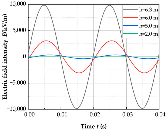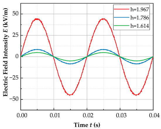 The electric-field distribution of the plumb line below the three-phase conductor is calculated. The analysis of the electric field below the A-phase wire is taken as an example. When t = 0.05 s, the electric-field distribution of the plumb line below the A-phase wire is shown in Figure 3. Where the vertical coordinate E is the electric-field strength in the vertical ground direction, the horizontal coordinate h is the vertical height from the ground.