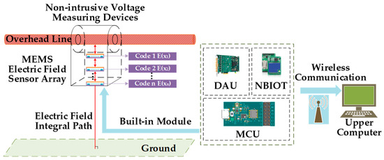 The online monitoring of transmission-line voltage can be realized by combining the near-end electric-field integration method and the MEMS electric field. The overhead-line-voltage monitoring system based on the near-end electric-field integration method is shown in Figure 6. The system consists of a non-intrusive voltage-measuring device and an upper monitoring computer. The non-intrusive voltage-measuring devices are designed according to the near-end electric-field integration theory. Inside the device are multiple arrays of microelectric-field sensors. The electric-field sensor array can accurately measure the electric-field intensity at the desired integration node. The voltage-measuring device includes a high-speed data acquisition unit (DAU), a narrowband internet of things (NBIOT) module, and a microcontrol unit (MCU). The DAU and MCU can collect the electric-field data of each node and calculate the wire voltage internally. Meanwhile, the NBIOT module sends the voltage-monitoring data to the upper computer. This scheme effectively addresses the issue that the existing electric-field integration method is difficult to apply to the transmission line.