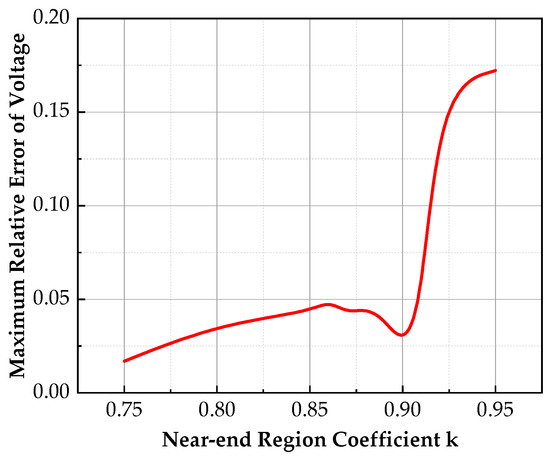The near-end electric-field integral method mainly calculates the electric-field integral value in the near-end area of the wire. Therefore, it is crucial to select the proportional coefficient of the near-end integral region reasonably to improve the measurement accuracy. According to the optimization results in Section 3.1, three integration nodes are selected in the near-end region and calculated by the Gauss–Chebyshev integral method. Considering that the scale coefficient of the near-end region falls within [0.75, 0.95], the inversion voltage under different k values is calculated.