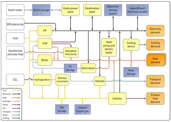 The input–output energy flow of frame diagram for EnergyPLAN software [56].