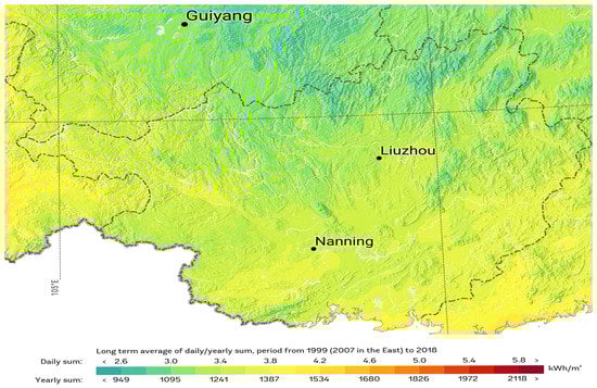 Guangxi annual average horizontal irradiation map from 2007 to 2018 [58].