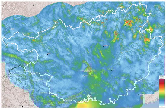 Guangxi distribution of the mean wind power density at 100 m [59].