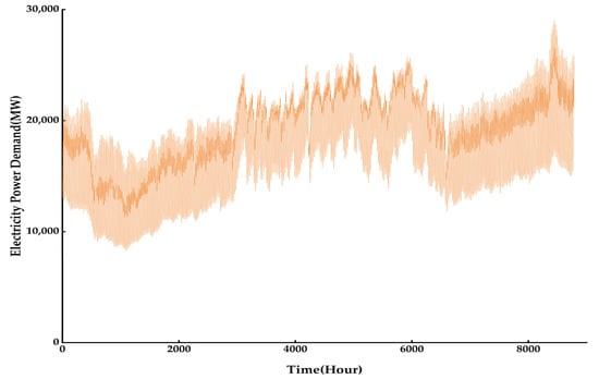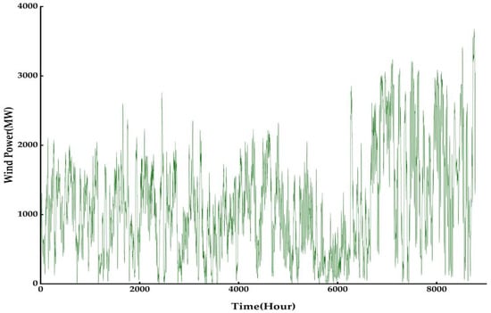 A reference model must be designed as a comparison to create and analyze future scenarios. This paper chose 2020 as the reference year because the energy data of 2020 are relatively new and available to obtain from the Internet. The data include information such as energy demand, installed capacity, and power generation from various power generation technologies, as well as their costs, mainly from [61,62,63,64,65,66]. Figure 4 and Figure 5 depict the hourly distributions plot of power demand and onshore wind power provided by the Guangxi power grid.