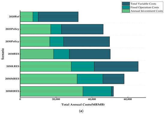 With the reduction of traditional thermal power input and the enhancement of clean substitution of fossil energy, the total annual costs decrease in the 2050HRES scenario compared with the other two 2050 scenarios.