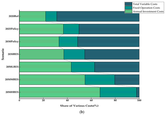 (a) The detailed simulation results of the energy system’s total annual costs in the seven scenarios. (b) Changes in the share of each category in the seven scenarios.