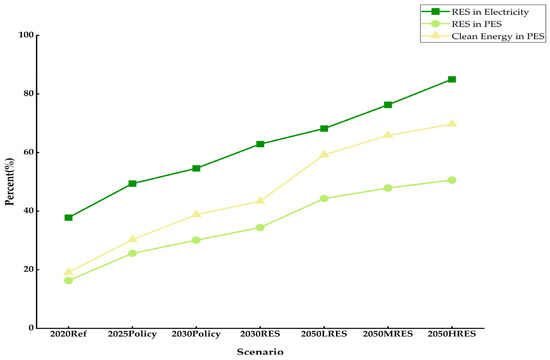 Figure 7 shows the evolution of primary energy consumption and CO2 emissions under seven scenarios. From 2020 to 2050, the government will vigorously promote the development and utilization of nuclear and renewable energy represented by wind–photovoltaic in power systems, as well as energy conservation and emission reduction policies in heat, transportation, and industry sectors. Therefore, the proportion of non-fossil energy consumption is expected to reach 30% in 2025 and about 40% in 2030, as shown in Figure 8. The results align with or even exceed the development levels planned by the government. After reaching its peak between 2025 and 2030, carbon emissions will begin to fall substantially. Despite a 62% increase in primary energy consumption, the 2050HRES Scenario can achieve a maximum reduction in carbon emissions of 57% compared with the 2020Ref Scenario. While the relevant policies and the adjustment of the fuel structure adopted by the government have facilitated the development of the energy structure towards a low-carbon direction, the limitations of technological upgrading and energy structure improvement will still result in a large amount of carbon dioxide production from fossil energy consumption in the industrial and transportation sectors. Nonetheless, the proportion of renewable and clean energy consumption is projected to increase from 16% and 20% in 2020 to a maximum of about 50% and 70% by 2050. As China has not yet established a comprehensive statistical accounting system for carbon emissions [73], this paper uses the carbon emission factors from the Chinese and Danish models in the EnergyPLAN website [74,75], as detailed in Table 9.