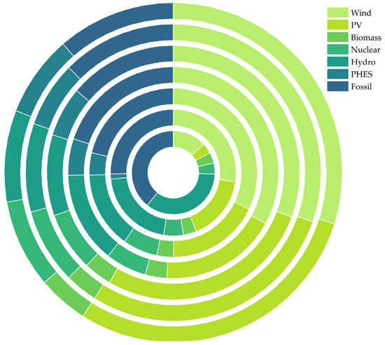 The proportion of various power generation installed capacity (The rings from inner to outer are 2020Ref, 2025Policy, 2030Policy, 2030RES, 2050LRES, 2050MRES, and 2050HRES.)