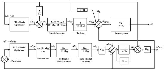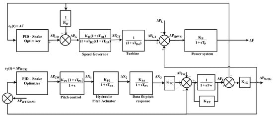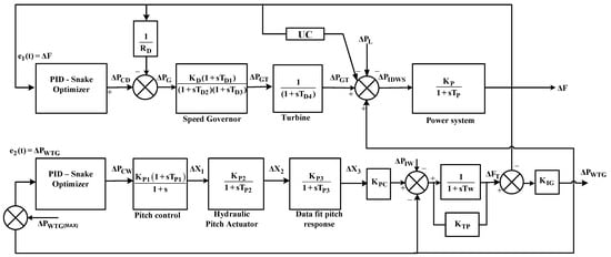 Hybrid power system (HPS) applications have met with numerous evolutionary computational intelligence (CI) techniques which have to some extent, enhanced and developed the HPS system. In [], genetic algorithms were applied to design a hybrid solar–wind generator with a battery bank as an ESD. In [], the amalgamation of different energy resources and energy storage elements was utilized to minimize frequency deviations. This research explored a PID controller with optimization algorithms to improve the frequency deviation of the generating structures, which gathered valuable methodological information from [], that utilized the particle swarm optimization (PSO) technique in the simulation studies of autonomous hybrid energy generation and energy storage structures. Although the PID controller has been optimized with different techniques, in [], the design and optimization of the controller parameters were optimized using the JAYA algorithm to be specific to the self-adapting multi-population elitist optimization, which targeted the ITAE and IAE objective functions. In [], the efficiency of the wind–solar generating structure utilizing hybrid energy storage was optimized by applying a combination of simulated annealing and PSO. The HPS model made up of solar–wind–fuel cell simulation in [] used the artificial bee swarm algorithm technique that not only resulted in the optimization of the model but showed that the HPS design was also cost-effective. In [], the studies of the simulated hybrid models utilized PV, fuel cells, DEGs, WTGs, battery energy storage, flywheel, aqua electrolyzer, and ultracapacitors, which were all optimized by a GA optimizer. A chaotic PSO and fractional order fuzzy control method was applied to an HPS with renewable energy generation, which was studied in []. A new and powerful quasi-opposition harmony search (QOHS) technique was used in [] to solve the frequency regulation problem of various power system models. In the current field of optimization techniques, multi-area power systems (MAPs) of a two-area non-reheat thermal system were explored and optimized with an Artificial Rabbit Algorithm (ARA) []. The AR algorithm was employed in optimizing the PID controller parameters for the load frequency control. Another MAP exploration optimization technique is the Coyote optimization algorithm, utilized with cascading controllers []. This multi-area power system exploration also included PV panels as a RES. With the advancement in the field of metaheuristic techniques used for the optimization problem, there is still a possibility to explore new and powerful optimization techniques such as the snake optimizer (SO) [] to solve power system problems in a much better and in an effective way and hence, this work set out to: