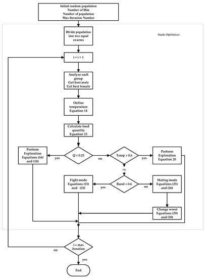 - Hashim, F.A.; Hussien, A.G. Snake Optimizer: A novel meta-heuristic optimization algorithm. Knowl.-Based Syst. 2022, 242, 108320. [Google Scholar] [CrossRef]