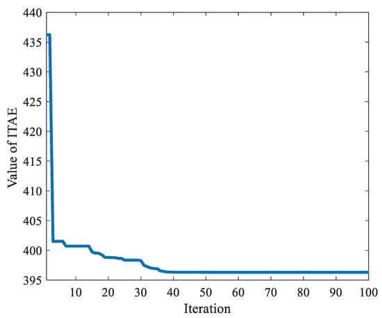 The convergence profile of SO during the minimization of the ITAE value is displayed in Figure 5, when the number of snakes and maximum iteration number was set to 50 and 100, respectively. As can be seen, after a sharp decrease in the early stages of the optimization, ITAE was reduced to 396.3 from 436.2 with no undesirable oscillation. Therefore, it can be inferred that SO can exhibit promising convergence characteristics. It may also be noted from Figure 5 that the algorithm stagnated and achieved the final solution after 50–60 iterations. No further improvement in the value of ITAE was gained afterward. This justifies our selection of the maximum iteration as 100 for the present study.