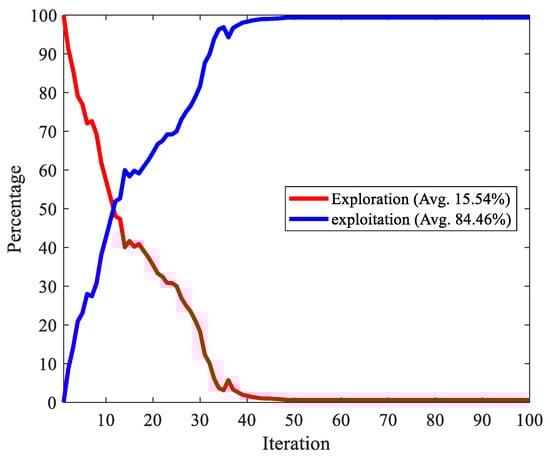 To provide better insight into the SO-based optimization procedure, the algorithm balance between exploration and exploitation properties is analyzed in Figure 6. The red line shows the global exploration capacity, while the blue curve stands for the local exploitation ability. It is apparent from Figure 6 that both exploration and exploitation existed in the algorithm, and a balanced transition between them can solve the global optimum solution effectively. After emphasizing a solid exploration in the early period of the optimization, SO started to promote exploitation as the algorithm iterates. On average, the portion of the local exploitation search of SO was larger than that of the global exploration search.