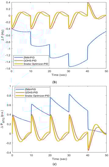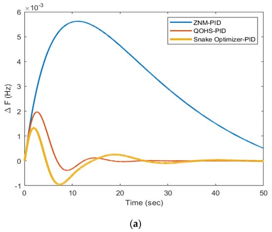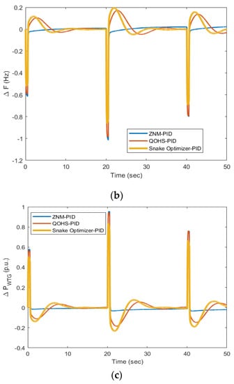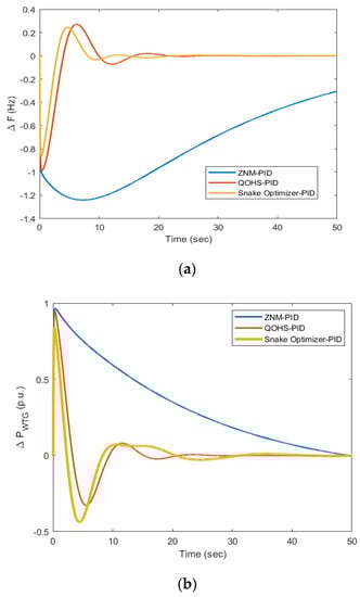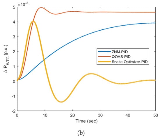 In the next step of the research and investigations, a 0.01 p.u. step change in the wind speed from the standard speed and the results of SO-PID were compared with those using ZNM-PID and QOHS-PID. The gains of the controllers were kept the same for the three techniques and the values of ITAE, IAE, and ITSE were obtained and are shown in Table 3. From results of Table 3, it was calculated that the ITAE obtained via ZNM-PID was 12.51 and was further reduced via QOHS-PID to 0.4405 and remarkably reduced to 0.1873 through SO-PID. The same trend was also seen for IAE and ITSE and the value of these errors were reduced to 0.01979 and 0.000156 in comparison to that obtained via QOHS-PID and ZNM-PID and hence SO performed better for this case as well. The graphical results are shown in Figure 8a,b for these techniques for a 0.01 p.u. step change in the wind speed. From the graphs in Figure 8a,b, it is critically seen that ΔPWTG (p.u.) responses showed higher oscillations and the system was not able to settle to a zero value within 50 s through ZNM-PID and QOHS-PID. There was a major steady-state error seen in the responses with a major overshoot. However, SO-PID was able to achieve minimum overshoot, fewer oscillations, and zero steady-state error in comparison to ZNM-PID and QOHS-PID. For ΔF, which is in Hz, the outcome of SO-PID was much better in comparison to ZNM-PID and QOHS-PID.