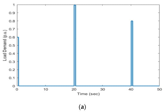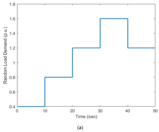 During the course of optimization, the PID controller gains were not optimized considering only one profile of load disturbance. Instead, they were procured under random changes in the load demand to accommodate the new condition. The random load input was limited to the range of −0.4 p.u. to 1.6 p.u., and it can be either in an increasing trend or decreasing trend, changing in steps with a specific duration of time.