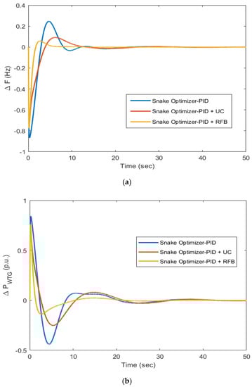 (a,b) Comparative output of PID with a UC or RFB for diesel–wind isolated system for a 1.0 p. u. step load alteration.