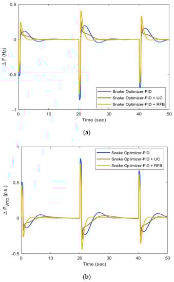 (a,b) The comparative output of PID with a UC or RFB for the diesel–wind isolated system for random load alterations.