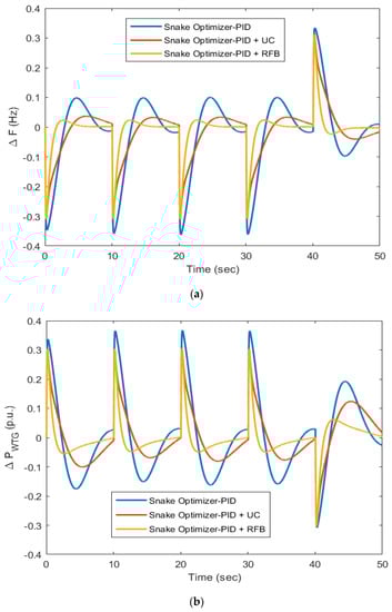 In the next step, the load was varied at 0, 20, and 40 s and the frequency and power deviation responses are shown in Figure 12a,b. These results showed the positive impact of the UC and RFB for diesel–wind isolated systems and that they were able to significantly improve the system responses. Here, SO-PID with RFB was also much better at reducing the frequency and power deviations in comparison to SO-PID with UC and with SO-PID only. The RFB and UC removed all oscillations from the system responses and improved the settling time for load changes at different times. Lastly, the impact of these ESDs were also checked for random load patterns applied to the diesel–wind isolated system and the results in Figure 13a,b clearly showed that if there is a continuous load change in the diesel–wind isolated system, the UC or RFB, with SO-PID can minimize unnecessary frequency and power excursions and maintained the system results at the reference value and can track the load demand more effectively. Still, the RFB and SO-PID combination was able to reduce the continuous oscillations and improve the dynamic output of the diesel–wind system for diverse cases.