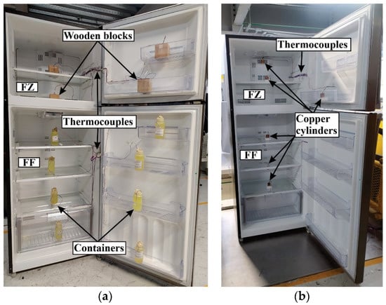 where 60,000 represents a conversion factor and W is the power consumed by the refrigerator. It should be noted that the power consumption of the refrigerator for each charge is estimated under the Mexican standard NOM-015-ENER-2018, whereby an interpolation is performed between the values obtained for power consumption and temperature at the FF and FZ for the damper positions (1/1, 5/5) of the refrigerator under study. The position 1/1 corresponds to an average temperature of −14.4 °C in the freezer and 7.2 °C in the fresh food compartment, while a temperature of −17.8 °C in the freezer and 2.8 °C in the fresh food compartment correspond to position 5/5. Equations (4) and (5) represent such interpolation, where the reported energy consumption corresponds to the maximum value between both equations.