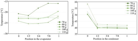 Figure 2 shows a greater irregularity in the refrigerant temperature along the evaporator compared to the temperature in the condenser. For the case of the evaporator, in this study the degree of superheating was defined as the difference between the refrigerant temperature at position one (temperature at the outlet of the evaporator) and the temperature at position three-quarters. The higher refrigerant charge ensures that flow is present along the evaporator two-phase and not completely vapor, which makes the process inefficient. Note that with a smaller quantity of mass (70 g), the evaporator is almost empty. Therefore, a greater quantity of mass is required to ensure the correct operation of the evaporator. On the other hand, the degree of subcooling in the condenser is defined as the difference in temperature in position seven-eighths and position one (temperature at the outlet of the condenser), representing a minimum variation between the different charges.